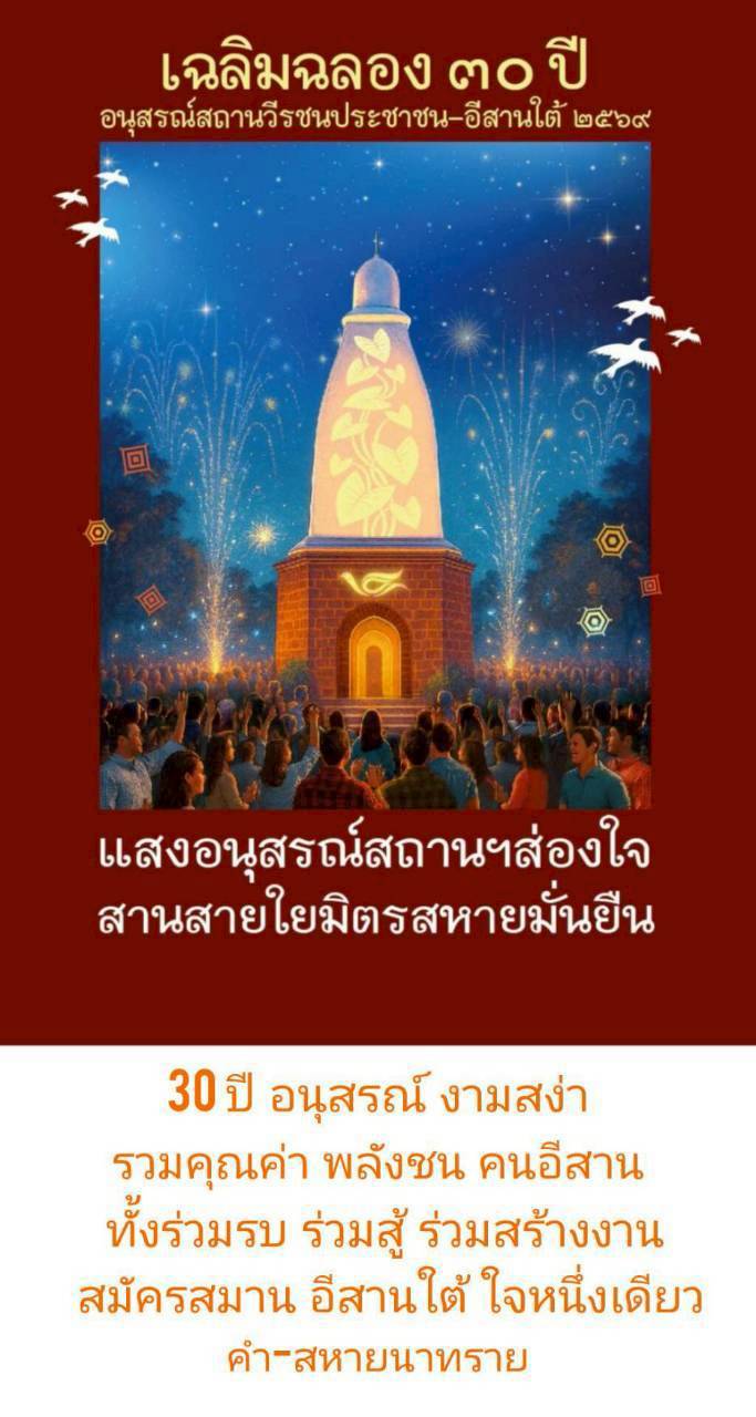 กำหนดการ "งานรำลึกวีรชน และเฉลิมฉลองครบรอบ 30 ปี อนุสรณ์สถานวีรชนประชาชน-อีสานใต้" ปี 2569