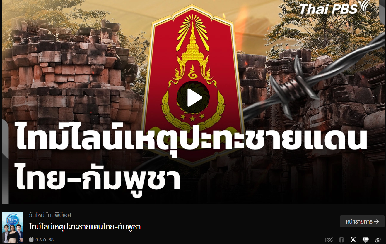 Published on 02 December 2025 | Hits: 3 Time Line เหตุปะทะไทย-กัมพูชา ระลอกใหม่ credit - ข่าว Thai PBS สนใจสมัครสมาชิกผู้มีส่วนร่วมกับสถานีข่าว สปท. โปรดคลิ๊ก